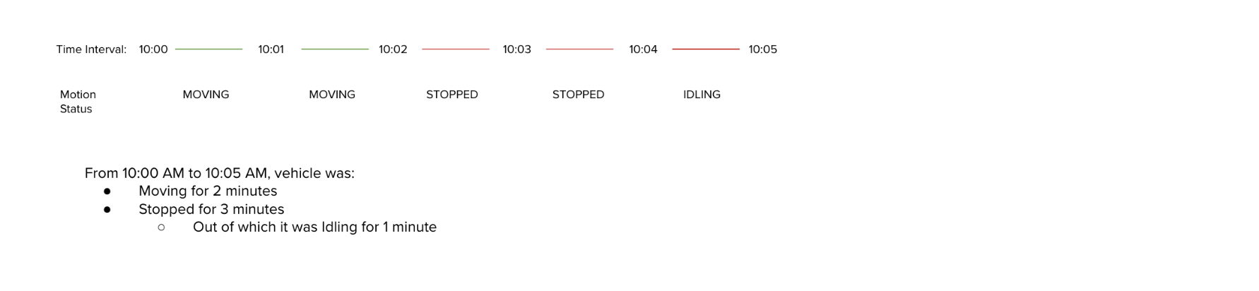 If a user wants to check the vehicle movement summary for a 5 minute interval from 10:00 AM till 10:05 AM, the system will break down the given time period into 1 minute intervals and checks the motion status for each minute