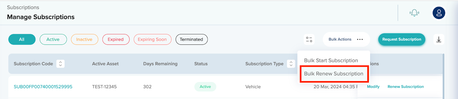 Step 2: Click on ‘Bulk Actions’ from the top-right, and select ‘Bulk Renew Subscriptions’.