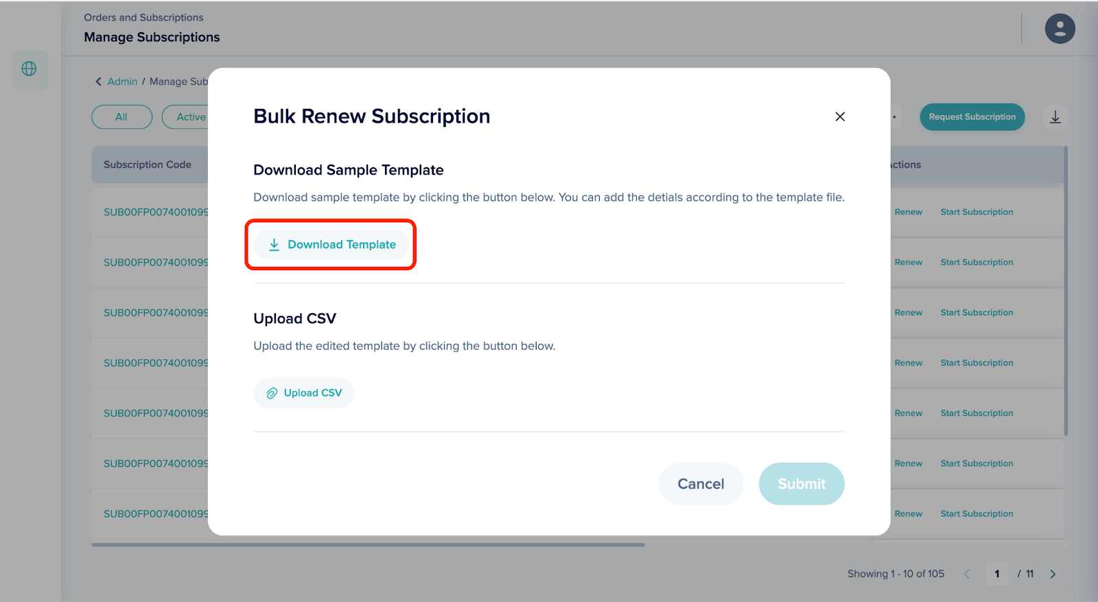 Step 1: Select the ‘Subscriptions’ module from the side navigation menu, and click on ‘Order Subscriptions’. A dashboard will appear with a list of all subscription orders or purchases on your account.